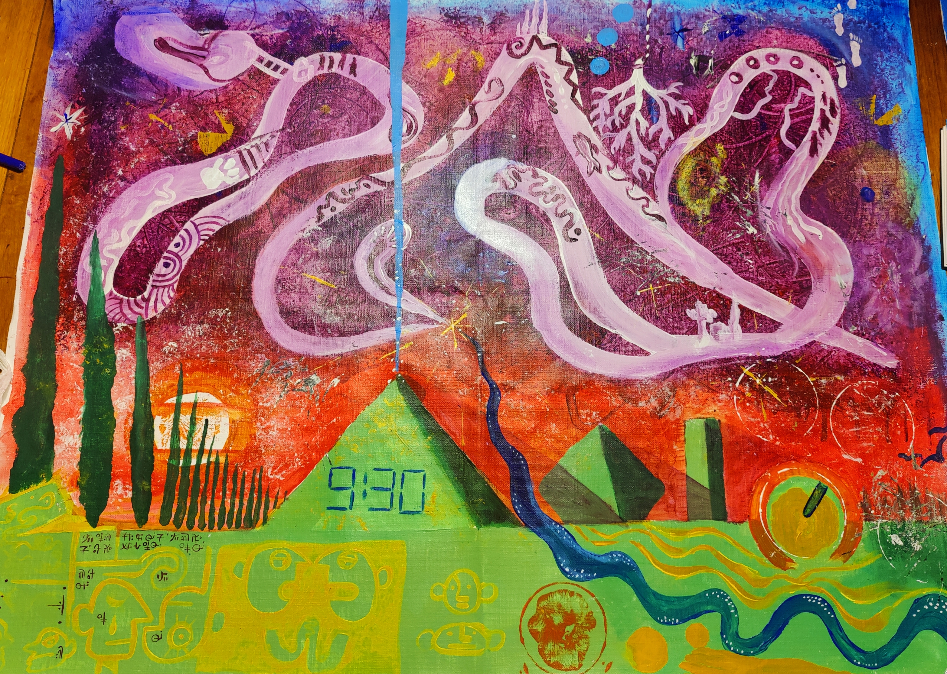 I love getting people to collaborate on a large canvas together. My workshop usually starts with a spiel about logistics and basic technique. Once everyone is up to speed, we begin with a short meditation to access our inner child/inner artist, and to allow ourselves to create freely. I’m available throughout the workshop to help, and add details throughout the painting, as well as coordinating collaboration by suggesting people to move around different sections of the canvas.